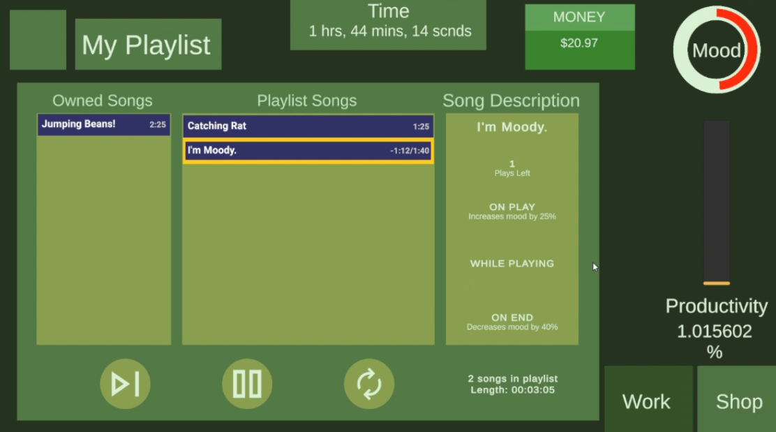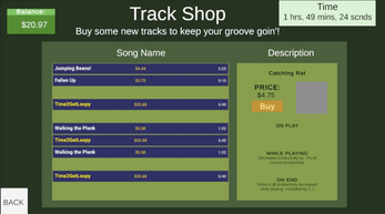 However, not all is lost. you can listen to songs while you work; each song has different abilities that will ultimately help you in your shift. Listen to music to not only keep your mood up, but also raise your productivity, and in return, get more money!! Loop, skip, or rearrange songs to your liking to find the best strategy!!